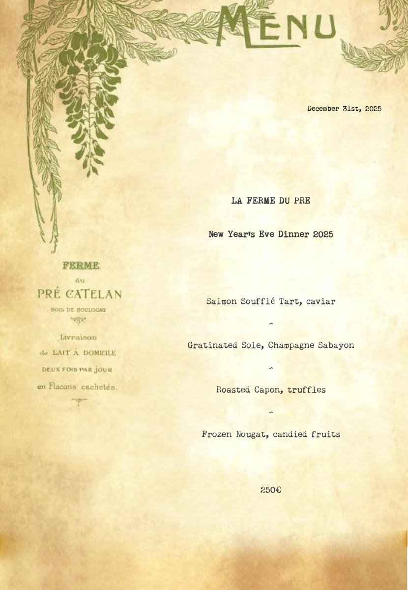 To celebrate the New Year in the authentic atmosphere of La Ferme du Pré, Chef Fréderic Anton offers a custom-made menu, specially created for New Year's Eve.